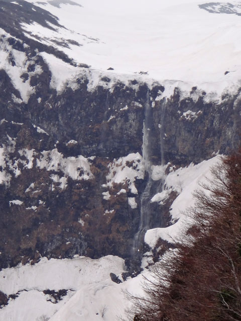鳥海山の登山口である鉾立から遠望できる。滝下へ行くには奈曽川を遡行する必要があるだろう。