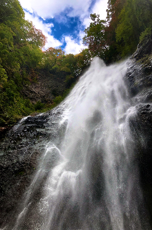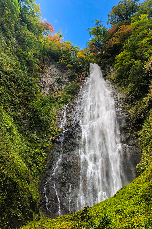 100選の一つ。白神山地に源を発する赤石川上流部にかかる滝。直瀑とも分岐瀑ともいえるような、岩の凹凸に散らばり落ちる姿は迫力がある。