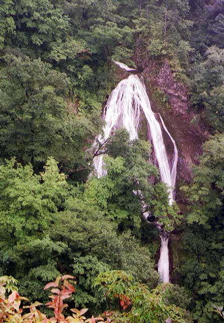 滝100選の一つ。美しい分岐瀑で、大きく二段になって流れ落ちる。
