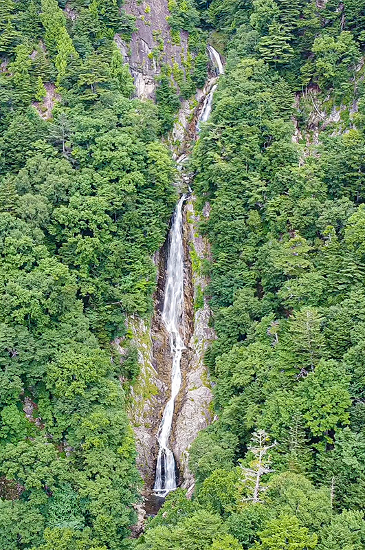 日光の最奥にある隠れた名瀑。青空から流れ下ってくる姿は豪快で、奥日光随一と言っても過言ではない。滝壺から最上段が見えないのが残念ではあるが、それでも十分な姿である。