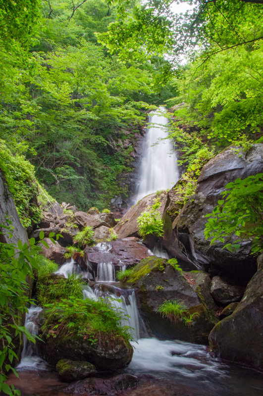 田母沢にかかっている滝で、やや距離の離れた二段の滝になっている。